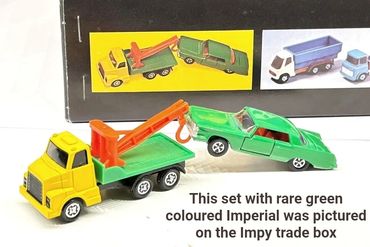 The Imperial was part of the rare ‘Silver Flyers’ range and is probably the easiest 'Silvers' model to find. When the Flyers were revamped in 1975 the Imperial had its bonnet cast shut but gained a roof rack complete with a plastic boat. A final version was issued in green and paired with a breakdown truck in the 'Impy Majors' range. This version is shown on the outer trade boxes for the ‘Impy Super Models’ range. This set with the green Imperial is very rare.