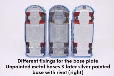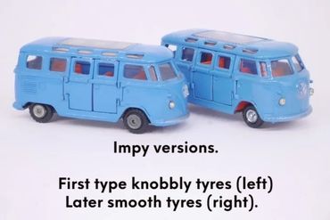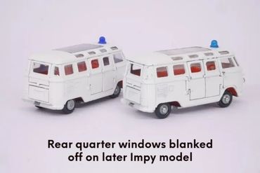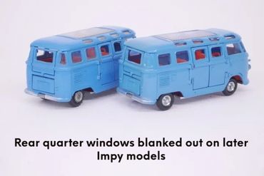 The Impy models initially had opening side doors, rear hatch and engine cover which revealed a nicely detailed engine. On very early models the side doors did not have the small latch to aid the opening of the doors. Early models also had the base held in place by a rectangular clasp which was later changed to a rivet. Another notable change was the blanking out of the rear two quarter lights, presumably to simplify the casting process.