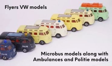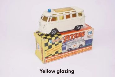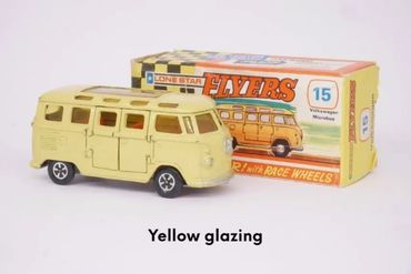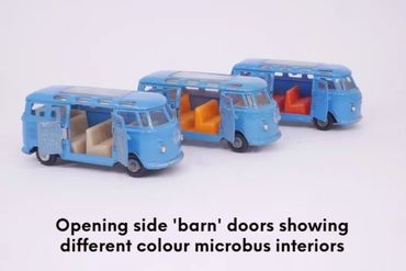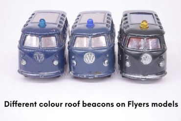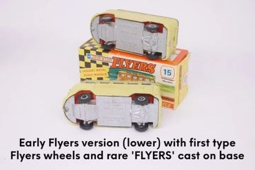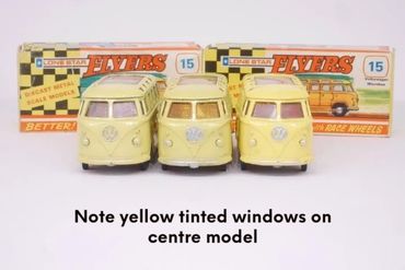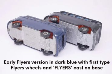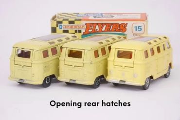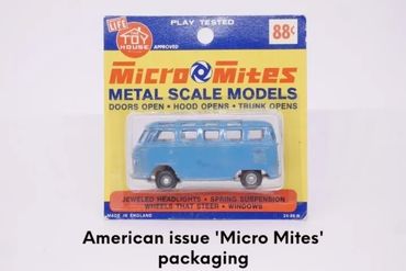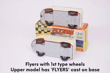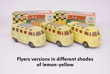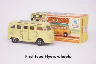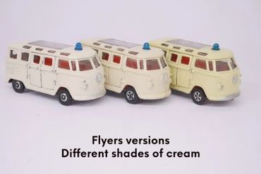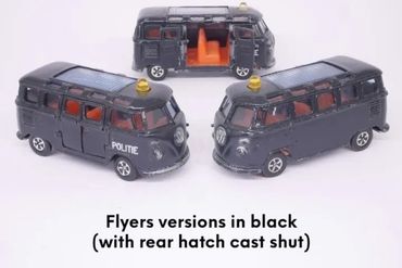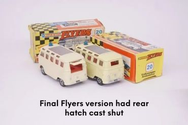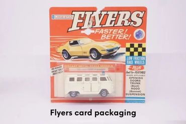 Flyers cars were initially issued in an adapted version of the Impy window box (F1), with many thousands issued like this in the UK through a Quaker Cereals give-away promotion. In America a similar promotion at a petrol/gas station chain gave away Flyers cars in plain white boxes (F2). The Microbus did not fit in either of these boxes so production of early Flyers examples must have been restricted to orders for carded models only. This explains why today early Flyers versions are hard to find.