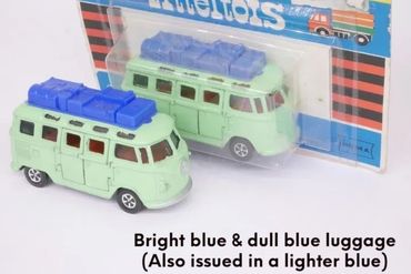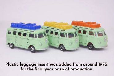 As with a number of the Flyers models, the larger Flyers ‘Hi-Speed’ wheels better suit the VW models rather than the overly small Impy wheels (these had to be small for the steering feature to work). During production some cost cutting was introduced, first the engine cover was cast shut followed by the rear window hatch. Perhaps to compensate for this, and give the model a refresh, plastic luggage was added to the roof from around 1975 for the final year or so of production.