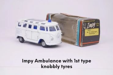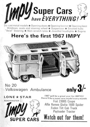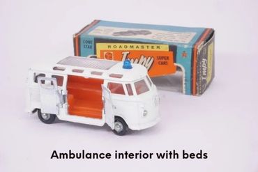 Following on from the Microbus the Volkswagen Ambulance was introduced by Lone Star as the first new model for 1967. The ambulance used the same base and body shell as the Microbus but with a hole in the roof for a plastic beacon. A new 'ambulance' interior was produced incorporating beds down either side. Many real Volkswagen Transporter models were adapted for use as Ambulances although not using the special edition 23 window Samba model like the Lone Star! Very early Impy models had a red cross on one of the side ‘barn’ doors but unfortunately this was quickly discontinued, probably to keep costs down.