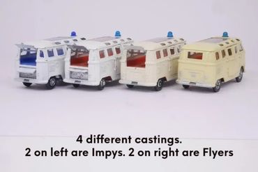 Like the rest of the Impy range the Volkswagen Ambulance was modified to become a ‘Flyers’ model in 1969. Early Flyers Ambulances can also be found with ‘FLYERS’ cast on the base before this was ‘wrongly’ deleted under the prenotion the two VWs were to become part of the Commercials range. (See No.15 Microbus for more details). As its very likely the same moulds were used for both models the Ambulance went through the same casting changes as detailed for the Microbus.