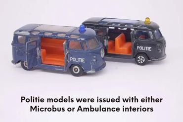 They were issued on Hema 'Litteltois' carded packaging. As with the Microbus and Ambulance the rear engine compartment and hatch went on to be cast shut. Models come with either the Microbus or ambulance interiors.