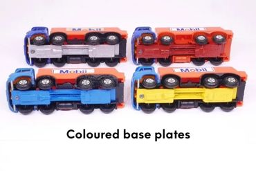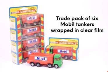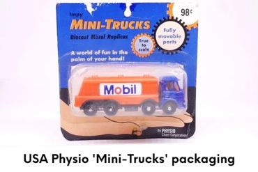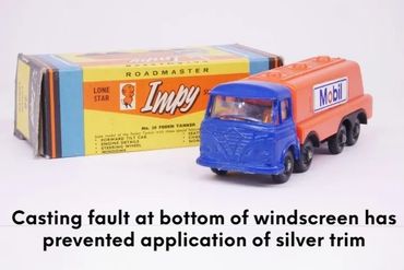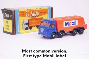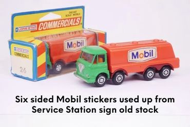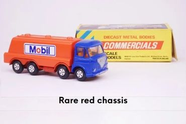 When the model finally appeared, it was of course sporting ‘Mobil’ labels and had an attractive tanker body design. Despite the box artwork showing an unusual white cab and orange body colour scheme, the model actually appeared with a blue or green cab and a red plastic tanker body.