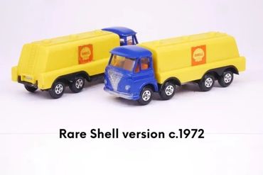Sometime around 1972, shortly after the model had been updated with ‘Hi-speed’ wheels, Lone Star issued the tanker in a new yellow and blue colour scheme complete with square ‘Shell’ labels. At the same time these Shell stickers also appeared on No.31 Ford Transit breakdown truck. Both ‘Shell’ models are hard to find so presumably they had a very short production run. Did Lone Star run into licencing problems with Shell? Whatever happened the tanker quickly returned to carrying Mobil labels which it did for the remainder of its production.