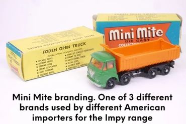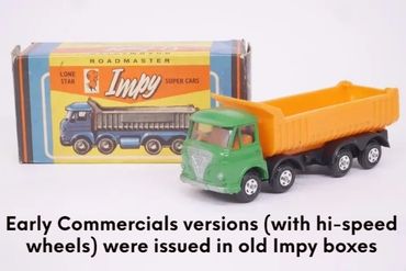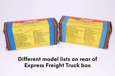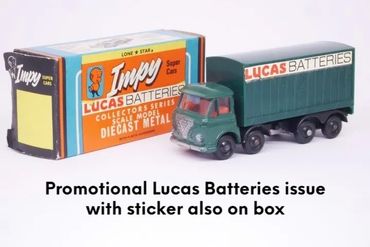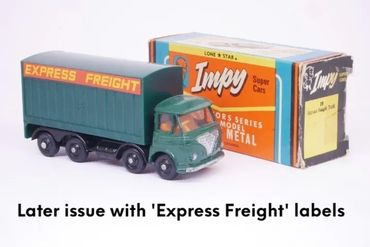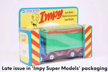 Initially issued as a promotional model for Lucas Batteries which did operate similar Foden lorries. I believe Lucas gave this model away at the October 1968 Earls Court Motor Show. Some promotional models also had the Lucas Batteries transfers applied to the box packaging. This model joined the main Impy range and featured as ‘new’ in Lone Star’s 1969 trade catalogue which made a special mention to the model’s box not having an illustration of the contents (unlike the rest of the range). Once stocks of the Lucas Batteries transfers were used up they were replaced by ‘Express Freight’ labels followed by a new blue/grey/red colour scheme and a new box now featuring a drawing of the model.