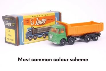 First of the Fodens and appropriately numbered No24 as it featured Foden’s attractive S24 tilt cab. Lone star launched their Foden tipper (or ‘Open Truck’ as they named it) in mid-1967 and it was the first commercial vehicle in the Impy Super Cars range. Despite the larger size of the Impy commercials Lone Star maintained the same price point as the Impy cars but in doing so had to cut back on most of the special features found on the cars. That said Lone Star’s Foden did have a realistic tilting cab as well as tipping body and an opening tail gate