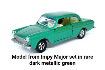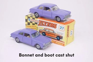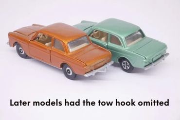 Three colours have been noted on Impy models and at least five on Flyers versions. The Taunus was one of three Flyers cars to receive a plastic roof rack in 1975 whilst at the same time the casting was altered to have the bonnet and boot cast shut. Impy models and early Flyers versions had a rear tow hook although there were no trailers in either range. The hook was omitted on late Flyers models.