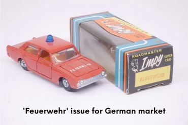 Standard Impy models had ‘Fire Chief’ printed on the bonnet. Some examples have this in a larger font (intended for use on Lone Stars 1/50 scale Fire Chief Chevrolet Corvair from its Roadmasters range). As with the Roadmasters Corvair, Lone Star produced a version of the Impy Corsair for the German market with ‘Feuerwehr’ printed across the bonnet. This is hard to find especially a boxed example.