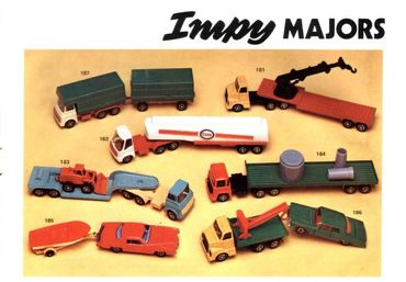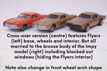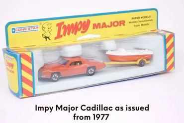 Perhaps to compensate for its short run as a Flyers, the Cadillac enjoyed an extended life becoming part of the Impy Majors range in 1977 where it was issued towing the Tuf-Tots speedboat and trailer. Also in 1977 a new range of low-cost Impy Super Models was launched. These were basically the old Flyers models now with blacked out windows and black plastic bases. The Cadillac featured in the range as No.72 usually finished in a bronze colour. The production of both the new low-cost Cadillac and the Flyers version for the Impy Majors set has resulted in a very interesting cross over model as shown below. This example features the Flyers metal base, wheels and interior but married to a bronze Impy bodyshell complete with blacked out windows. A real Friday afternoon special!