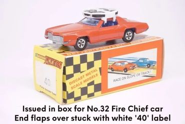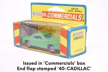 It was also the only Flyers model not to get its own picture box. I guess issuing the model with no opening features suggests Lone Star already knew the writing was on the wall for the Flyers range so there was little point going to the trouble of producing a box for this model. Instead, it was predominately issued on blister pack cards. When an order demanded boxed models the Cadillac was either issued in another Flyers box with ‘40’ paper stickers glued on the end flaps or it was issued in the new ‘Commercials’ window box! Examples of both are shown below.