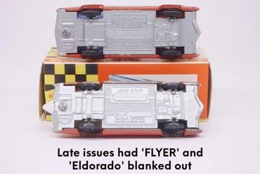 Despite being easily identifiable as Cadillac’s distinctive 8th generation of Eldorado, Lone Star only ever listed their version as ‘Cadillac’. Flyers models were given the full ‘Cadillac Eldorado’ name on the baseplate but the ‘Eldorado’ part was later blanked out. Possibly there was some licencing issue with Cadillac (which may have also contributed to the delay of the model's release?). Perhaps a licencing issue is not surprising given rivals, Hot Wheels, Siku, Dinky Toys and Husky / Corgi Rockets had all produced models of this same 8th generation Eldorado!