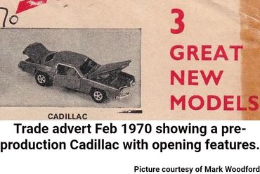 Any frustrations caused by the delay of this model were not helped when in 1970 and 1971 Lone Star included the Cadillac in its trade catalogues complete with reference number and drawings of the car! It then disappeared until the 1975 trade catalogue when a photo of the actual model finally confirmed its release. Interestingly the 1970 and 71 drawings show the Cadillac with opening doors and bonnet like the rest of the Flyers. A trade show advert (below) shows an actual pre-production Cadillac Flyers model (rather than just a drawing) also with opening features. It seems strange that this model was at the pre-production stage in early 1970 but still didn't materialise for a further 5 years.