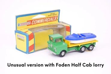 In 1972 Lone Star finally gave its Impy commercial range some long overdue attention. The trio of attractive Foden S24 cab lorries (Nos, 24, 26 and 29) had been the only lorries in the range for the previous 5 years. 1972 saw the introduction of new ‘Commercials’ branding and more excitingly two new lorry cabs. These were the Foden S50 (introduced on No. 42 Tilcon Half Cab) and a Leyland cab based on the revolutionary prototype gas turbine lorry. This Leyland cab was initially paired with a new flatbed body to give two new models: No.41 Builders Supply Lorry (carrying a load of plastic girders) and No.44 Marine Transport Lorry (carrying a plastic speedboat taken from the Tuf-Tots range).