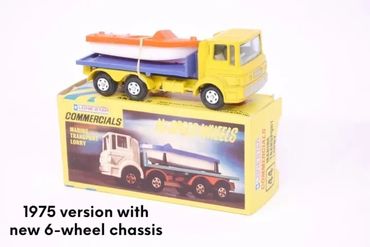 In 1975 Lone Star introduced some cost-cutting measures to the range by replacing a number of the 8-wheel lorries with shorter 6-wheel versions. No.41 Builders Supply Lorry and No.44 Marine Transport Lorry both continued in the range but now based on the new 6-wheel chassis. The 6-wheel chassis could take either the Leyland cab or Foden half cab. At this time several new lorry bodies were added to the range plus two new models were created by simply introducing new loads for the 6-wheel flatbed. No.43 carried four ‘water pipes’ whilst No.45 carried two ‘giant connecting watermain pipes’.