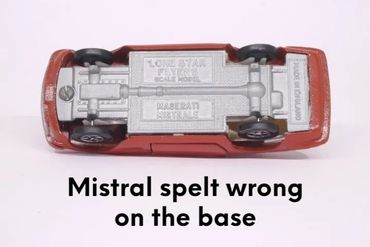 The attractive Maserati (along with the Lotus Europa) were the first completely new models to be added to the Flyers range where they joined the existing 16 cars converted from the Impy models. The Lotus was numbered No.36 but bizarrely Lone Star numbered the Mistral No.9 (The Impy range had started at No.10). The sporadic numbering continued with the next 3 new Flyers cars entering the range as Nos 38, 13 and 7!