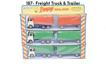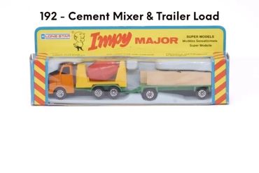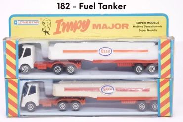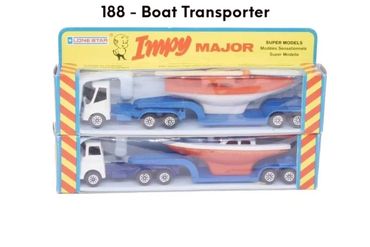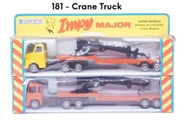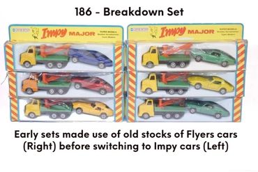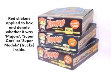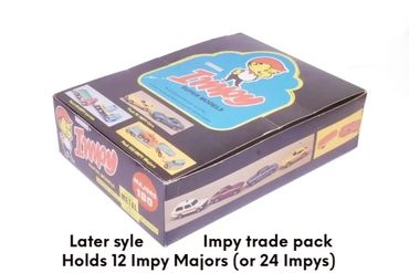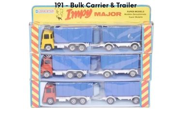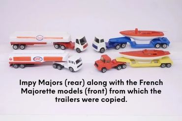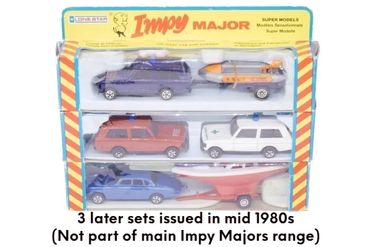 By 1980 the 'Majors' range had expanded to 12 models, mainly by adding 4-wheel draw-bar trailers to more of the Impy trucks. As stocks of Flyers cars were used up these were replaced with the 'Impy Super Models' cars.