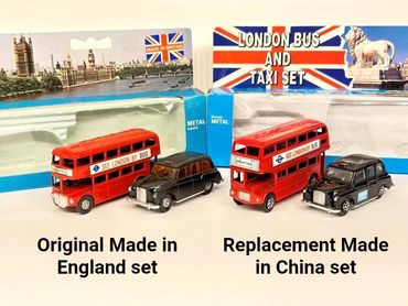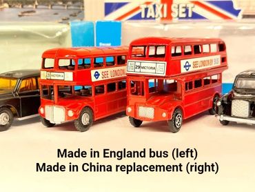The bus and taxi continued to be available under Wicke ownership from 1983 right up until the closure of Lone Star’s last UK factory in 1988. In these final years both models appeared in packaging with ‘British Made’ stickers added, a last ditched attempt to fight back against the onslaught of cheap China made toys flooding the UK.