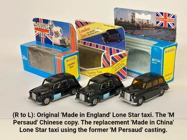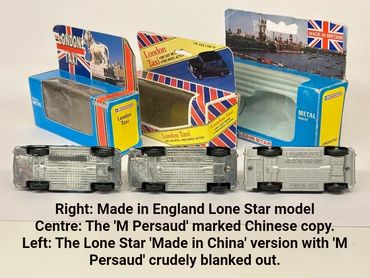 The M.Persaud name under both models was crudely blanked off as the bus and taxi now appeared in full Lone Star branded packaging with the Routemaster even featuring near identical stickers to the ‘Made in England’ original. Continuity was obviously a key consideration as Lone Star didn’t bother to update its trade catalogue images with the new China models.